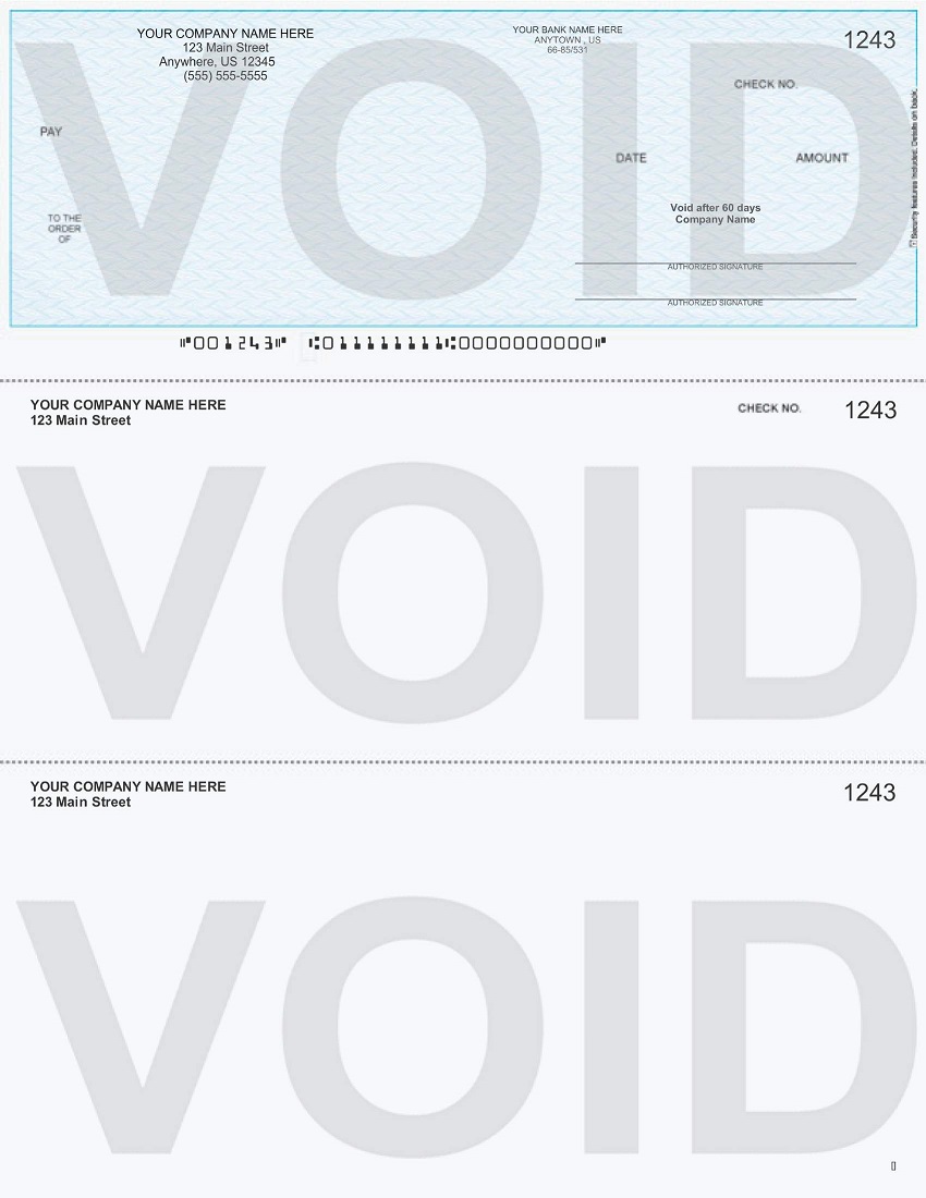 This multi-purpose check comes with your business and bank information preprinted on it. Print ready black and white logos are free.